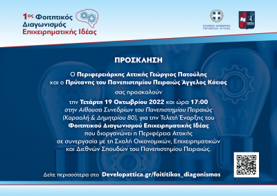 Ο Πρύτανης του Πανεπιστημίου Πειραιώς καθηγητής κ.Άγγελος Κότιος, έχει τη χαρά να σας προσκαλέσει στην εκδήλωση για την επίσημη έναρξη του Φοιτητικού Διαγωνισμού «Επιχειρηματικής Ιδέας», που διοργανώνει η Σχολή Οικονομικών, Επιχειρηματικών και Διεθνών Σπουδών του Πανεπιστημίου Πειραιώς σε συνεργασία με την Περιφέρεια Αττικής. Η αξιολόγηση των προτάσεων θα γίνει από επιστημονική επιτροπή απαρτιζόμενη από μέλη ΔΕΠ της Σχολής. Η εκδήλωση θα πραγματοποιηθεί την Τετάρτη 19 Οκτωβρίου 2022 και ώρα 17:00, στην Αίθουσα Συνεδρίων του Πανεπιστημίου Πειραιώς.