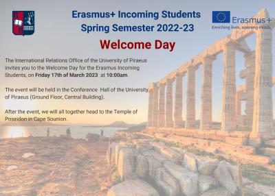 The International Relations Office of the University of Piraeus invites you to the Welcome Day for the Erasmus Incoming Students, on Friday 17th of March 2023 at 10:00am.