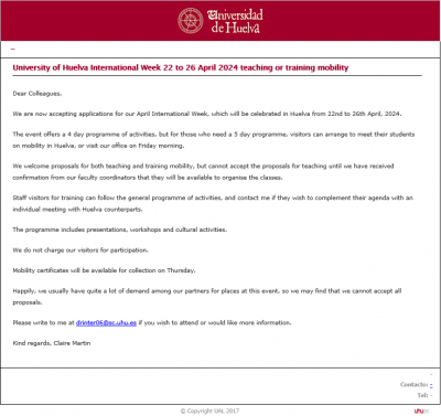 Διεθνής Εβδομάδα Επιμόρφωσης/Διδασκαλίας στο Πανεπιστήμιο της Huelva, Απρίλιος 22 - 26, 2024