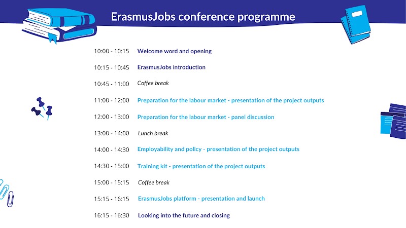 Το συνέδριο ErasmusJobs θα πραγματοποιηθεί στις 7 Δεκεμβρίου 2021, με έναρξη στις 11:00 (ώρα Ελλάδος) και θα είναι σε ηλεκτρονική μορφή. Οι εγγραφές για το συνέδριο άνοιξαν και μπορείτε να γραφτείτε εδώ έως την 1η Δεκεμβρίου.