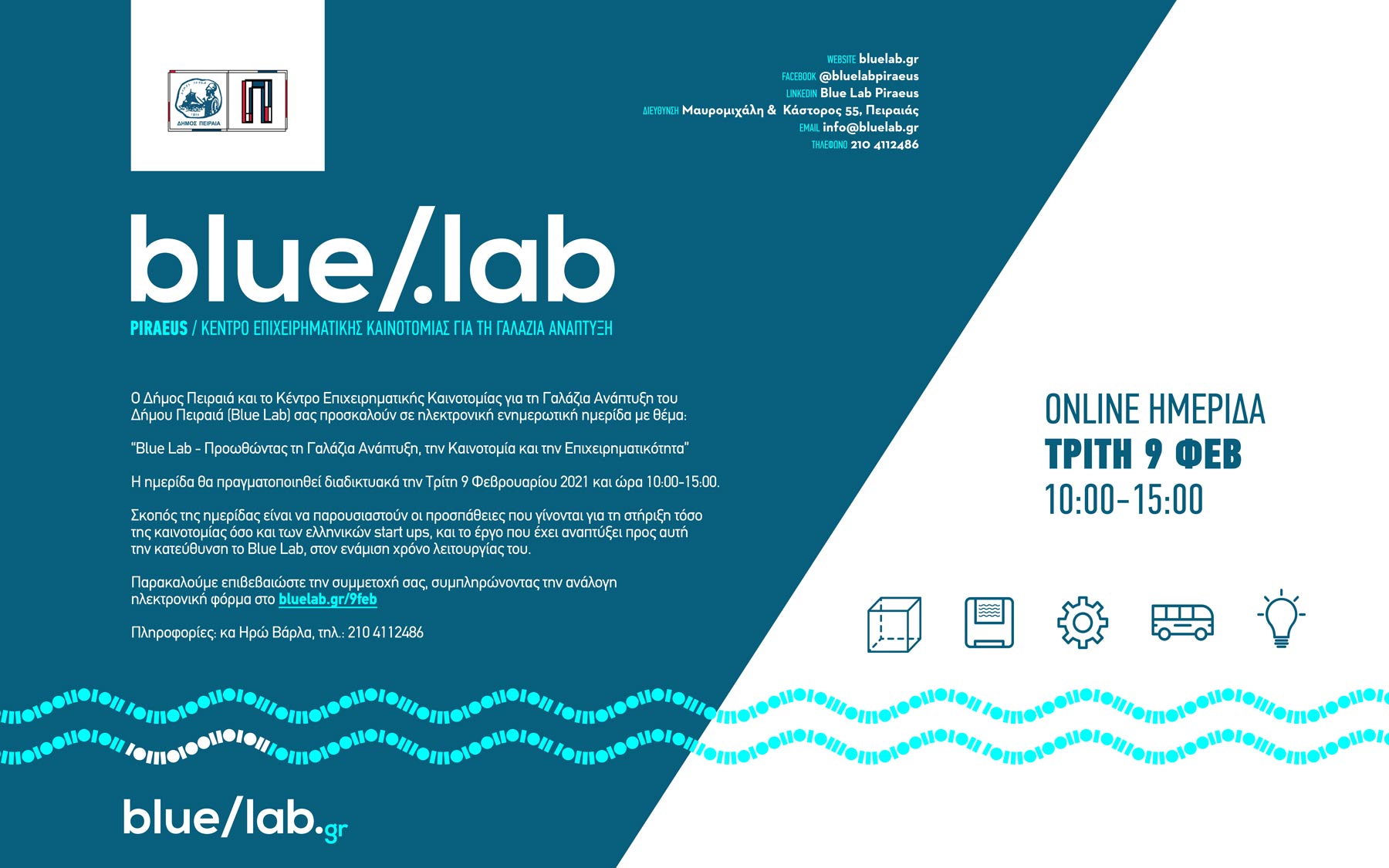 Πρόσκληση για την διαδικτυακή ημερίδα που διοργανώνει ο δήμος Πειραιά και το Κέντρο Επιχειρηματικής Καινοτομίας για τη Γαλάζια Ανάπτυξη του Δήμου Πειραιά, Blue Lab θέμα: